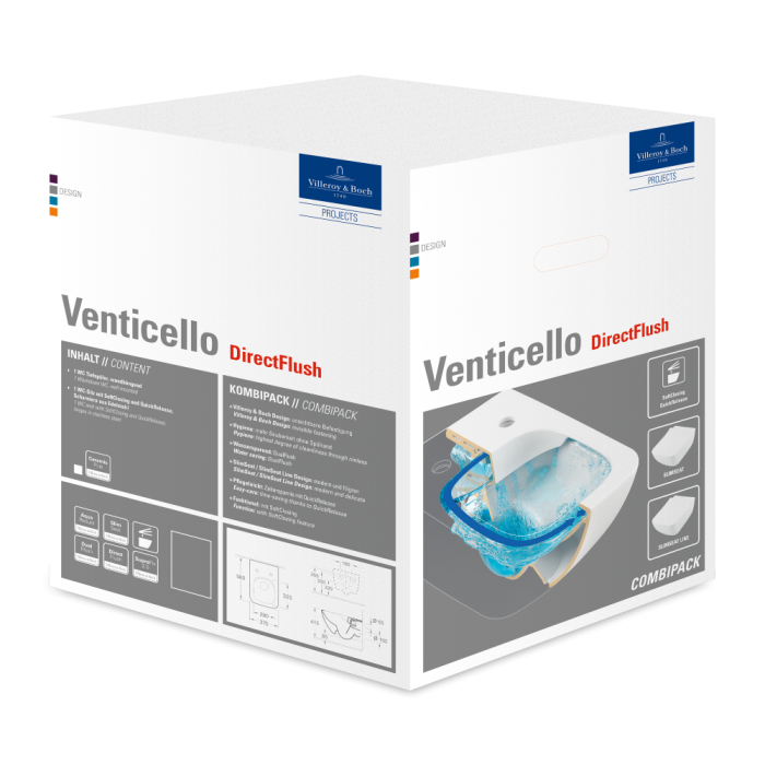 1 x унитаз с вертикальным смывом и с открытым смывным краем, 1 x сиденье для унитаза 1 x крепежный комплект |